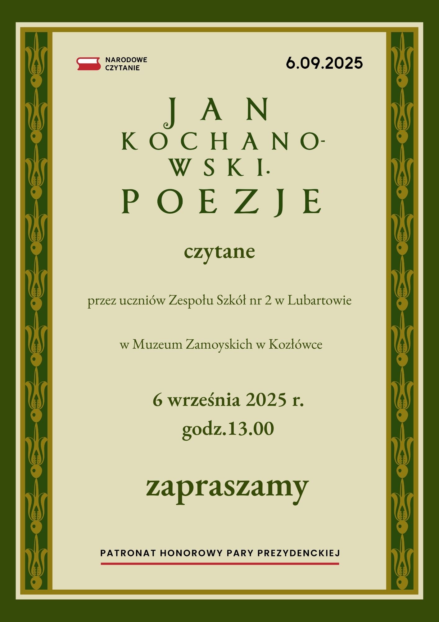 Do wysłuchania pieśni umieszczonej w dramacie „Odprawa posłów greckich”, jak i innych utworów poetyckich Jana z Czarnolasu, zapraszamy 6 września 2025 roku o godz. 13.00.