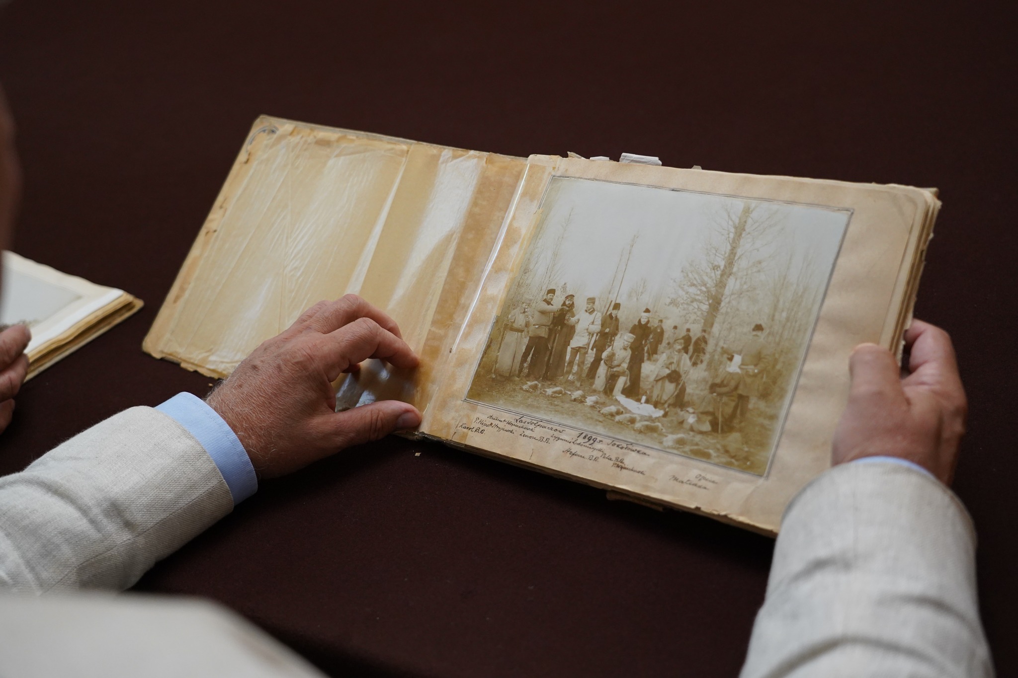 Przekazanie Muzeum przez Państwa Andrzeja i Anielę Belina Brzozowskich dwóch zabytkowych albumów z fotografiami rodzinnymi. Od lewej: Sławomir Grzechnik, główny inwentaryzator, Andrzej Pruszkowski, dyrektor muzeum, Andrzej Belina Brzozowski, Jadwiga Inka Zamoyska, Aniela z Czetwertyńskich Belina Brzozowska