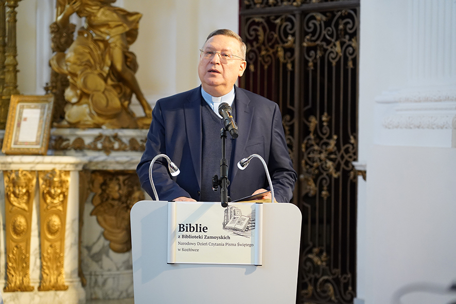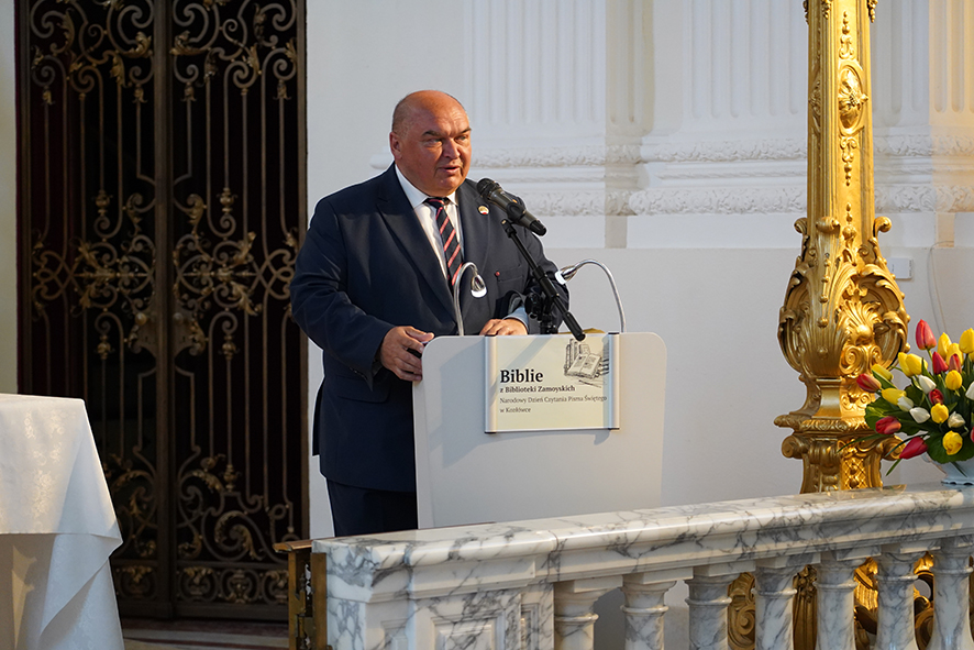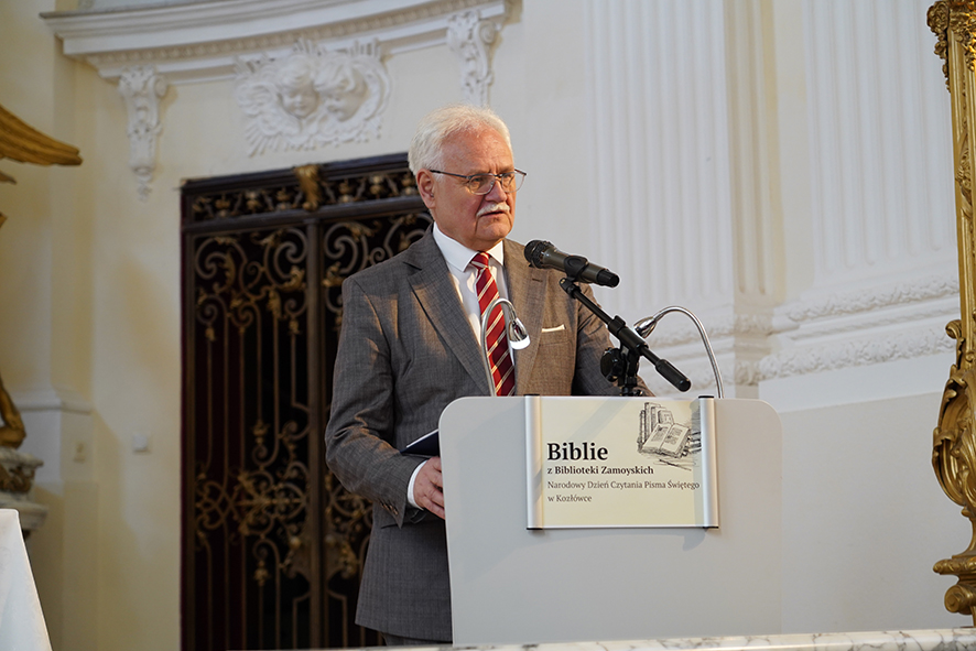 Rozpoczynając wydarzenie Andrzej Pruszkowski Dyrektor Muzeum Zamoyskich stwierdził: „spotykamy się w otwierającym Tydzień Biblijny Narodowym Dniu Czytania Pisma Świętego w miejscu niezwykłym. Jest nim wybudowana przez pierwszego ordynata kozłowieckiego Konstantego Zamoyskiego na wzór słynnej kaplicy wersalskiej kaplica pod wezwaniem Zwiastowania Najświętszej Marii Pannie. Jesteśmy w miejscu modlitwy wielu osób bardzo znaczących dla naszej historii, w tym – ukrywającego się tutaj podczas niemieckiej okupacji – późniejszego Prymasa Tysiąclecia. Ród Zamoyskich, herbu Jelita, których godło herbowe znajdujemy na przepięknych witrażach kaplicy, tak owe trzy skrzyżowane włócznie interpretował: „Niech Ci te trzy kopie przypominają potrójny cel życia: w rodzinie, Ojczyźnie, Kościele; potrójną walkę z sobkowstwem, zwątpieniem, niewiarą, potrójną nagrodę jeśli wytrwasz: miłość rodziny, szacunek narodu, błogosławieństwo Kościoła. Do każdej walki wypróbowanych tych kopii używaj, a choć zraniony zostaniesz, to mniej boli niż odstępstwo, niż grzech, jedyne prawdziwe nieszczęście od czego Boże uchowaj”. Jakże to aktualne wezwanie. W swej pałacowej bibliotece Zamoyscy zgromadzili ok. 10 000 woluminów z różnych dziedzin i okresów, napisanych w 14 językach. Wśród nich do najważniejszych zaliczamy kilkanaście wydań Biblii. Nie są one – niestety – na co dzień dostępne dla zwiedzających. Naszym celem jest udostępnienie w możliwie jak największym zakresie zasobów biblioteki czytelnikom w internecie.”