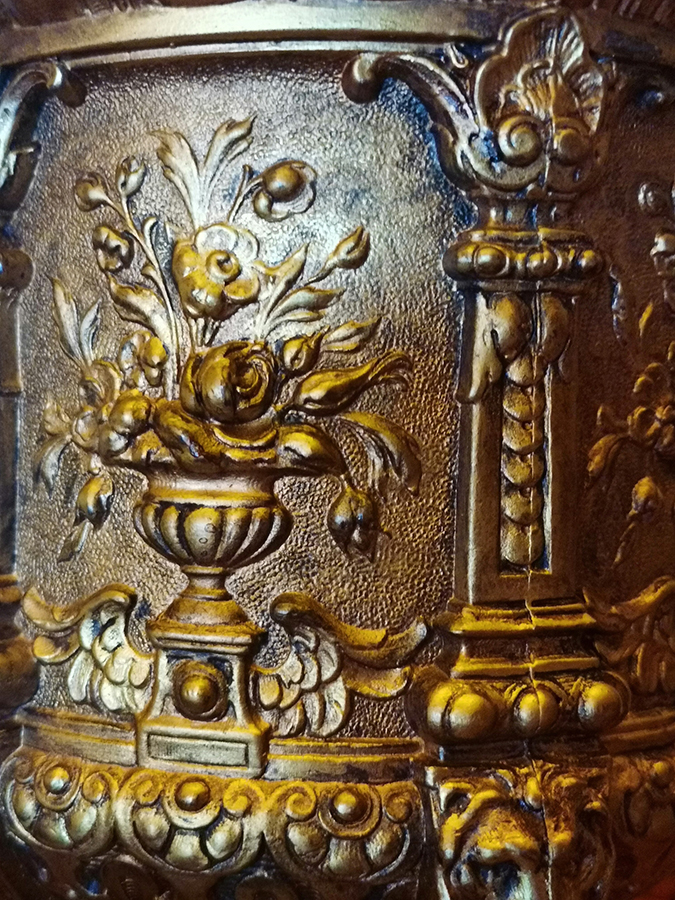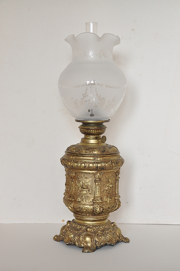 Następną będzie lampa w kształcie przysadzistego pucharu. W bogatej dekoracji podstawy i korpusu odnajdziemy maski lwów, ornamenty okuciowe, kimation, a na pokrywie wokół palnika muszle i liściaste łodygi. Na dekorację korpusu składają się także, naprzemiennie ułożone, półplastyczne pilastry i wazony z bukietami kwiatów. Kominek jest smukły, wybrzuszony w dolnej części i dopasowany do rodzaju palnika. Na pokrętle palnika pierścieniowego typu Kosmos umieszczono znak graficzny wykonawcy. Klosz o kształcie kwiatowym z wysoką kryzą i dekoracją w postaci trawionych girland i łańcuchów nie jest oryginalnym elementem tej lampy.