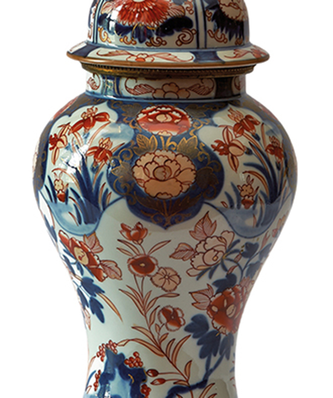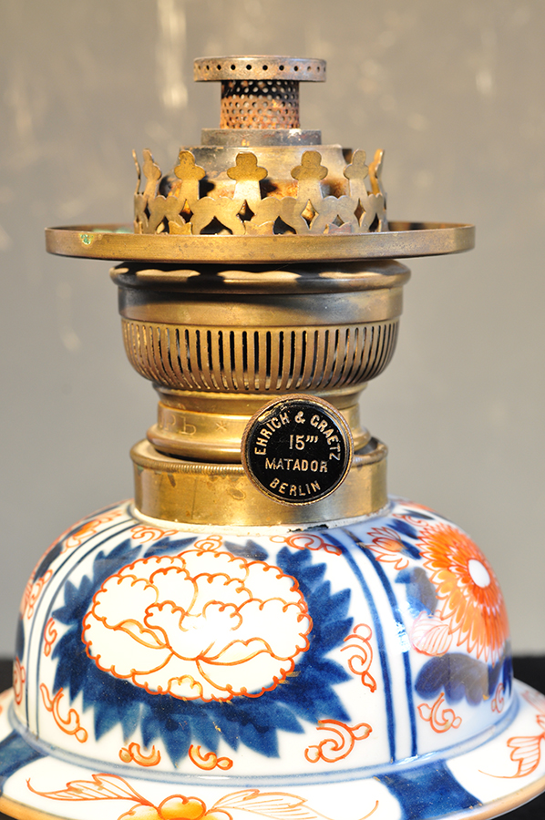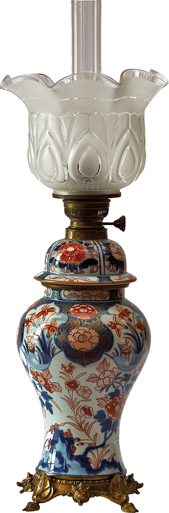 Omówione powyżej lampy stanowią dary dla Muzeum Zamoyskich w Kozłówce. W 1982 roku zbiory muzealne wzbogaciła natomiast zakupiona na rynku antykwarskim lampa z korpusem udekorowanym w typie Imari. (Nazwa tego zdobienia stanowi ogólne określenie pewnego rodzaju japońskiej ceramiki i wywodzi się od nazwy portu, z którego przez wiele lat eksportowano do Europy wyroby ceramiczne.) Korpus lampy wykonany był w Japonii, natomiast jej serce – palnik w Niemczech. Oba elementy pochodzą z 2. połowy XIX wieku. Mosiężna podstawa opiera sią na nóżkach w formie zwierzęcych racic. Na porcelanowym korpusie przedstawione zostały na białym tle kwiaty lilii, goździków i chryzantem, a w czterech wydzielonych kwaterach w formie wieloliścia kwiaty goździków. Motyw ten powtarza się w dekoracji przykrywy. Użytymi barwami są czerwień i kobalt, podkreślone złoceniami. (Czerwień w Japonii oznacza życie, szczęście i bohaterstwo.) Zbiornik na naftę ukryty jest wewnątrz korpusu. Palnik pierścieniowy typu Matador wykonano w berlińskiej firmie Ehrich & Graetz, a na jego pokrętle, przy znaku graficznym wytwórni, zamieszczono informację o optymalnej szerokości knota: 15 linii. Kominek został prawdopodobnie dobrany. Klosz jest w kształcie kwiatowym, w przekroju ośmioboczny.