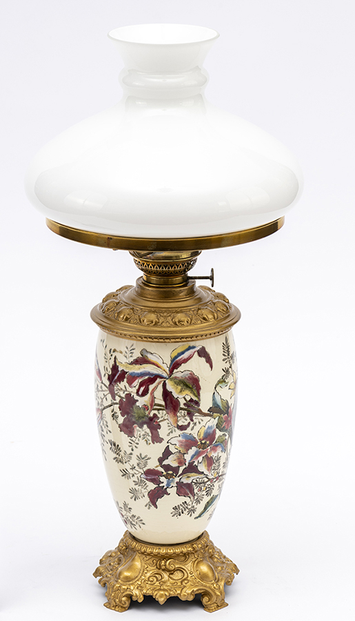 Lampa naftowa, Francja, Bayeaux – Valentine (?), 2. połowa XIX wieku; porcelana, szkło, farby naszkliwne, mosiądz; nr inw. MPK/CS/2212