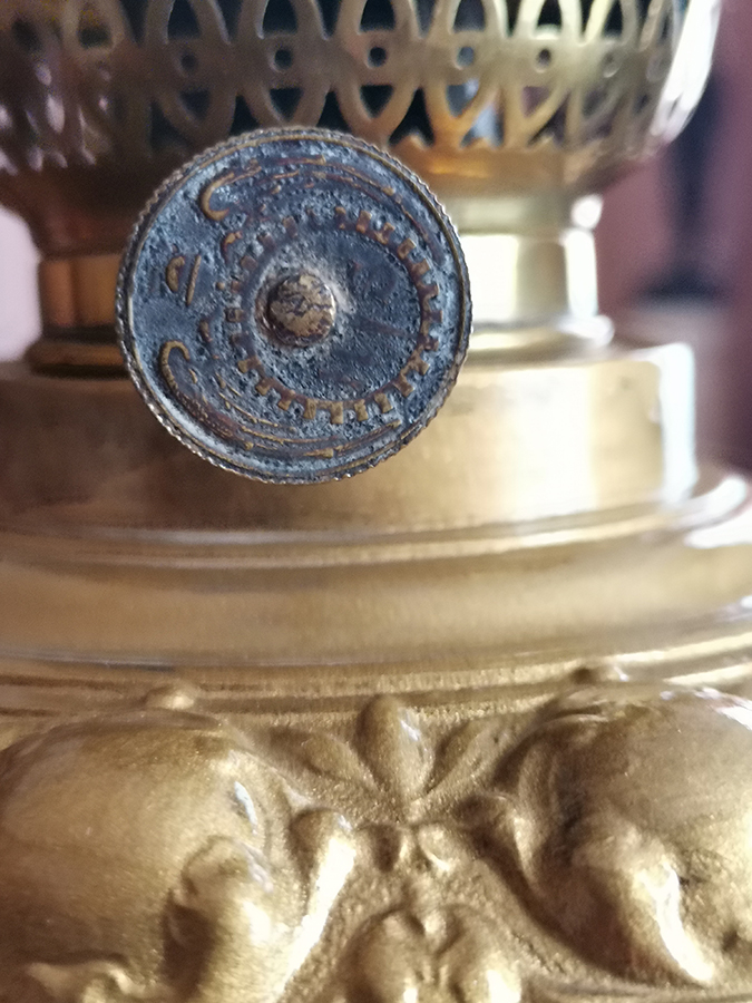 - Fragment zbiornika i pokrętła lampy naftowej; Anglia, początek XX wieku; mosiądz; nr inw. MPK/CS/2054