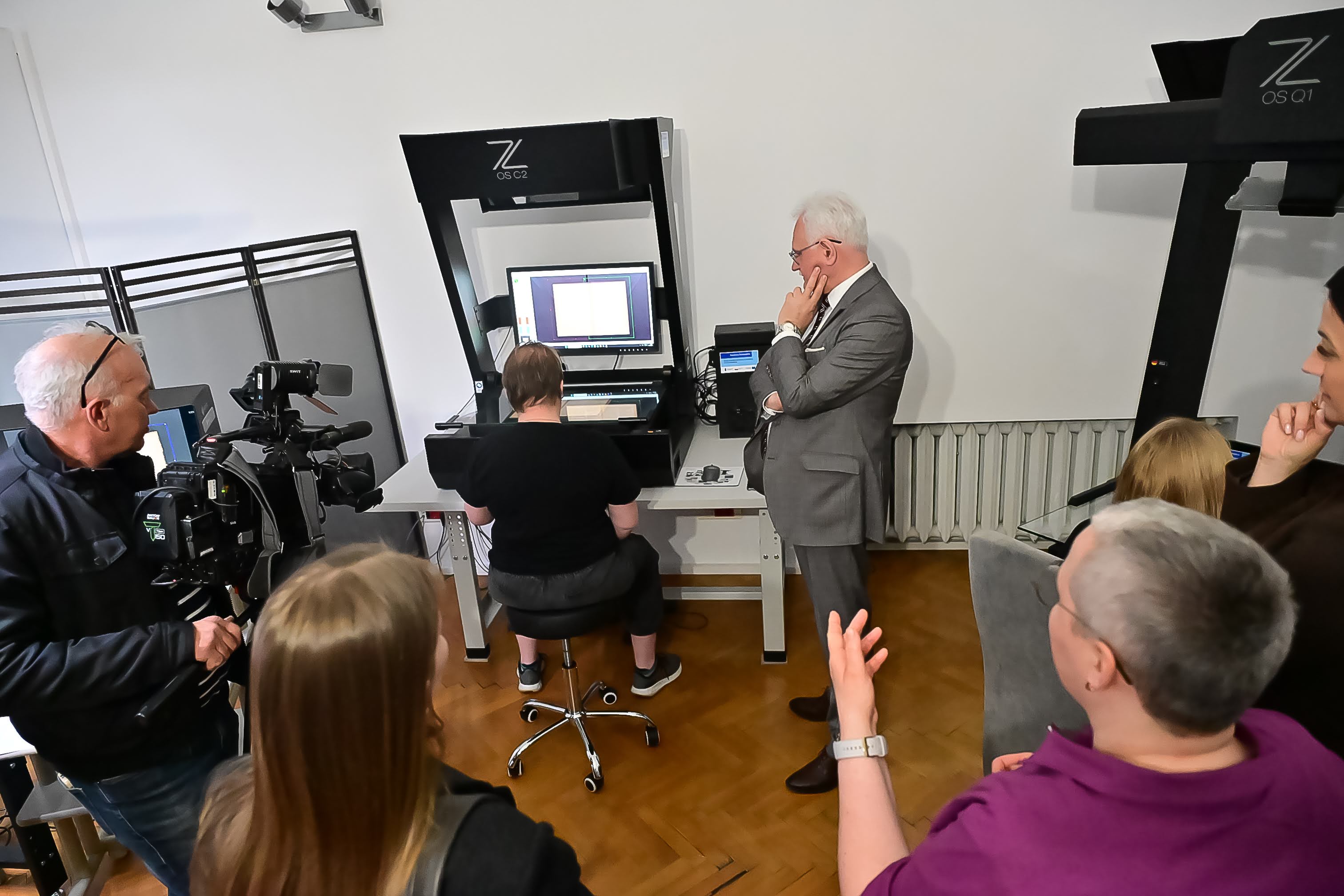 Po oficjalnej części spotkania zaprezentowano zaplecze techniczne Biblioteki – specjalistyczny sprzęt do digitalizacji, który zapewni realizację projektu z zachowaniem wysokich standardów jakości oraz bezpieczeństwa zbiorów.