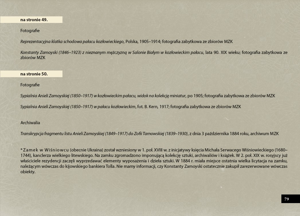 Plansza ma jasne, beżowe tło z delikatną fakturą. Zawiera wyłącznie tekst – nie ma na niej fotografii ani ilustracji. U góry po lewej stronie widnieje nagłówek „na stronie 49.”, poniżej słowo „Fotografie”. Pod nim wymieniono dwa opisy zdjęć: reprezentacyjnej klatki schodowej pałacu w Kozłówce z lat 1905–1914 oraz fotografii przedstawiającej Konstantego Zamoyskiego z nieznanym mężczyzną w Salonie Białym w pałacu, z lat 90. XIX wieku. Niżej znajduje się kolejny nagłówek: „na stronie 50.”, a pod nim ponownie dział „Fotografie”. Wymieniono dwa opisy dotyczące sypialni Anieli Zamoyskiej w pałacu w Kozłówce – jeden odnoszący się do widoku na kolekcję miniatur po 1905 roku, drugi do fotografii z 1917 roku wykonanej przez B. Kerna. Pod spodem umieszczono sekcję „Archiwalia”. Zawiera ona informację o transkrypcji fragmentu listu Anieli Zamoyskiej do Zofii Tarnowskiej z 3 października 1884 roku. Na dole planszy znajduje się przypis oznaczony gwiazdką. Tekst objaśnia historię zamku w Wiśniowcu – jego powstanie w pierwszej połowie XVIII wieku z inicjatywy księcia Michała Serwacego Wiśniowieckiego, późniejsze losy kolekcji oraz informacje o licytacji w 1884 roku. W prawym dolnym rogu widoczny jest numer strony: 79. Całość ma charakter informacyjny i przypomina stronę z katalogu lub publikacji historycznej.